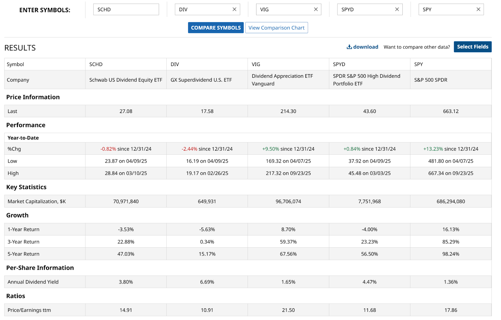 Will High-Yield Stocks Ever Compete with the S&P 500 Again? These Dividend ETFs Say the Jury’s Out.![]() There was a time when dividend stocks were as popular with retail investors as any type of equity investing. In fact, after the twin wealth-destruction periods of 2000-2003 and 2007-2009, many bruised investors shied away from growthier names, barely wanting to touch stocks at all. Fast-forward to 2025, and the script has clearly flipped. The largest U.S. dividend-focused ETF, the Schwab US Dividend Equity ETF (SCHD) has $70 billion in assets under management. That pales in comparison to scores of growth stock ETFs. And while the Vanguard Dividend Appreciation ETF (VIG) is a larger fund at nearly $100 billion, it yields just 1.6%. That’s not far above the S&P 500 Index’s ($SPX) yield, which has been sub-2% for the majority of the past decade. And if yield is the primary motivation, as it is for many retired or near-retirement investors, that’s a tough way to make a living. That has led to a lot of reaching for yield, which historically works until it fails. And when it fails, it can be debilitating both financially and psychologically. That’s because stocks of sound businesses that pay solid dividends can be treated as poorly as high-flyers coming down from overvalued states during bear markets. Until there’s a reckoning that lasts more than the brief ones we’ve had for the past 16 years, this will be just another one of those early warnings that doesn’t stick. So many ETFs have the word “dividend” or “income” in them now that it is not a stretch to say that many investors could have a false sense of security in those securities. Here’s a summary table that shows the potential future turmoil. This does not include dividend returns, so interpret the results as the level of vulnerability a dividend ETF has when the tailwind of ever-higher stock prices finally erodes. As we see, this is already impacting the ETFs that own stocks with higher yields. But for now, those stocks are doing well enough to avoid any alarm bells going off. ![]() In the table, we see that SCHD is doing just fine without the dividend portion of the return. Nearly 9% a year compounded over 5 years (47% cumulative return over that time). However, it is actually down over the past 12 months, such that the yield of 3.8% is just breaking shareholders even for that decline. How long will investors be OK with this? That’s the magic question, to which I don’t have a magic 8-ball to answer. And, while VIG and the SPDR S&P 500 ETF (SPY) have made hefty price returns for the past several years, the recent negative run in the price of the SPDR S&P High Dividend Portfolio ETF (SPYD), which owns the 80 largest yielders in the S&P 500 Index, is another cautionary sign. The Takeaway HereThis is a great time to know three things about your dividend ETF: