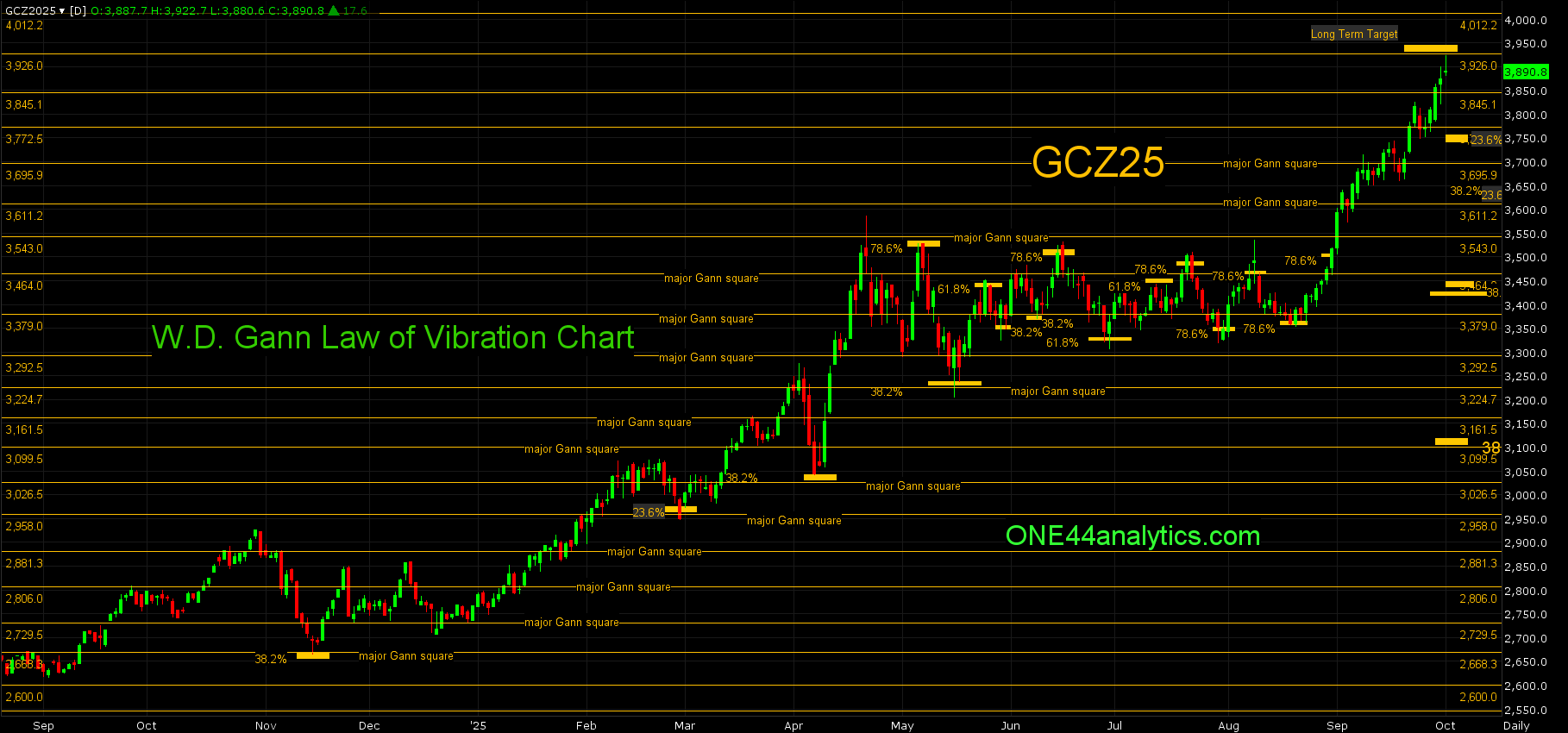 There are two methods we use at ONE44 to find support and resistance in the markets. The first are major Gann squares, these are the yellow horizontal lines on the chart. The second is Fibonacci retracements. This is our latest Video on how to use the Fibonacci retracements with the ONE44 rules and guidelines. NEW VIDEO In the update below we have the swing point and what to look for above and below based on the two methods of analysis. You can sign up here for free Gold, Crude Oil, SP500 & Bitcoin Updates. This is from the 9/4/25 update, GCZ25From Sunday,