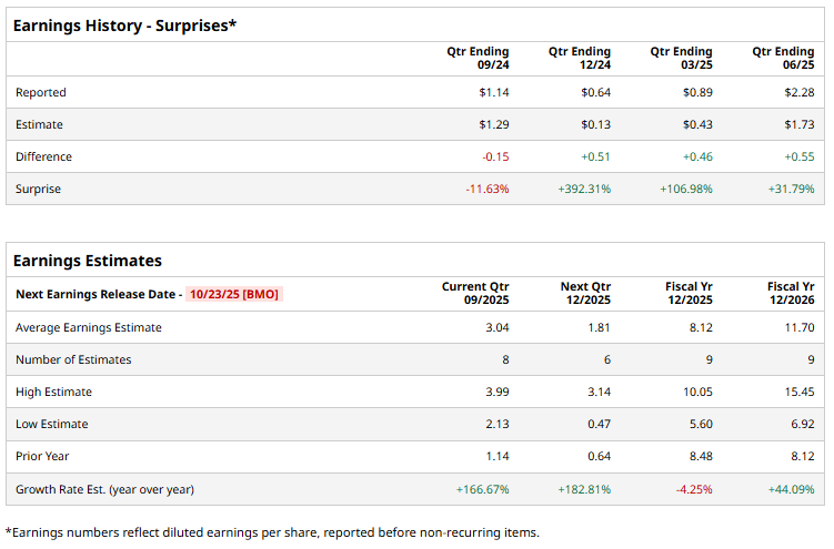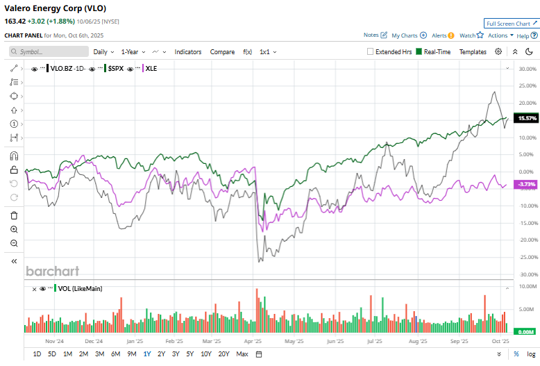 Valero Energy’s Quarterly Earnings Preview: What You Need to Know![]() Valero Energy Corporation (VLO) is a leading American energy company headquartered in San Antonio, Texas. As the largest independent petroleum refiner globally, Valero operates 15 refineries across the U.S., Canada, and the U.K. and is currently trading at a market cap of $50.8 billion. The energy behemoth is set to unveil its third-quarter results on Thursday, Oct. 23, before the market opens. Ahead of the event, analysts expect VLO to report non-GAAP earnings of $3.04 per share, up 166.7% from the profit of $1.14 per share reported in the year-ago quarter. Additionally, the company has surpassed the Street’s bottom-line projections in three of the past four quarters, while missing on one occasion. For the current year, its earnings are expected to be $8.12 per share, down 4.3% from $8.48 per share reported in the year-ago quarter. However, in fiscal 2026, its earnings are expected to rise 44.1% year-over-year to $11.70 per share. ![]() VLO stock has surged 14.8% over the past 52 weeks, outperforming the Energy Select Sector SPDR Fund’s (XLE) 4.1% decline but underperforming the S&P 500 Index’s ($SPX) 17.2% uptick during the same time frame. ![]() On Sept. 30, Valero Energy fell more than 1% as energy producers and service providers retreated following a drop in WTI crude oil to a one-week low. The consensus opinion on VLO is fairly optimistic, with a “Moderate Buy” rating overall. Of the 19 analysts covering the stock, opinions include 11 “Strong Buys,” one “Moderate Buy,” and seven “Holds.” VLO’s mean price target of $171.12 indicates a potential upswing of 4.7% from the current market price. On the date of publication, Kritika Sarmah did not have (either directly or indirectly) positions in any of the securities mentioned in this article. All information and data in this article is solely for informational purposes. For more information please view the Barchart Disclosure Policy here. |