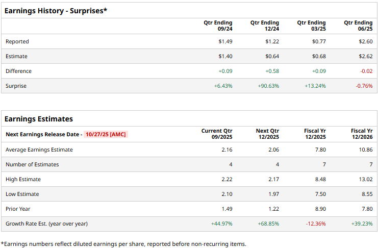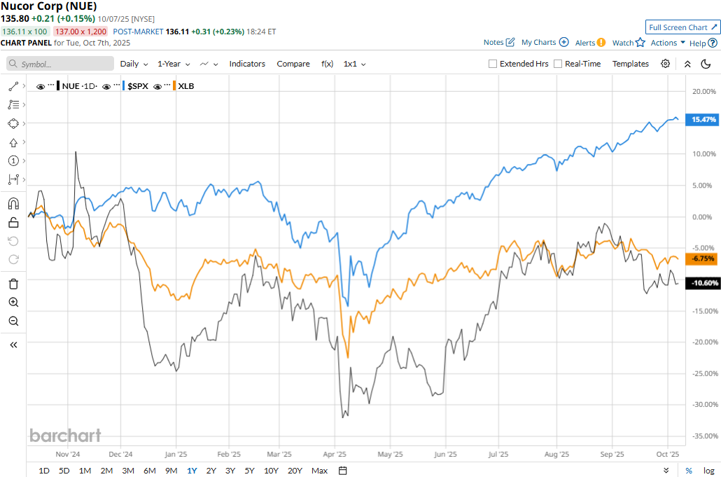 What You Need To Know Ahead of Nucor's Earnings Release![]() Charlotte, North Carolina-based Nucor Corporation (NUE) is a leading producer of structural steel, steel bars, steel joists, steel deck, and cold finished bars. With a market cap of $31.1 billion, Nucor operates through steel mills, steel products, and raw materials segments. The steel manufacturer is gearing up to announce its Q3 earnings after the market closes on Monday, Oct. 27. Ahead of the event, analysts expect Nucor to report a profit of $2.16 per share, up 45% from $1.49 per share reported in the year-ago quarter. The company has a mixed earnings surprise history. While it missed the Street’s bottom-line estimates once over the past four quarters, it surpassed the projections on three other occasions. For the full fiscal 2025, Nucor is expected to report an EPS of $7.80, down 12.4% from $8.90 reported in 2024. While in fiscal 2026, its earnings are expected to surge 39.2% year-over-year to $10.86 per share. ![]() NUE stock prices have declined 11.1% over the past 52 weeks, notably underperforming the Materials Select Sector SPDR Fund’s (XLB) 5.8% drop and the S&P 500 Index’s ($SPX) 17.9% surge during the same time frame. ![]() Nucor’s stock prices declined 2.7% in the trading session following the release of its disappointing Q2 results on Jul. 28. Despite the favorable tax and trade policies of the current federal administration, including the high tariffs on steel and aluminum imports, the company’s results remain underwhelming due to its inefficiencies. Nucor’s topline for the quarter grew 4.7% year-over-year to $8.5 billion, which came mostly in line with the Street’s expectations. However, due to an increase in cost of goods sold and high marketing, admin, and other expenses, the company’s bottom-line dropped 6.5% year-over-year to $603 million, missing the consensus estimates. The consensus opinion on the NUE stock remains optimistic, with an overall “Strong Buy” rating. Out of the 14 analysts covering the stock, 10 recommend “Strong Buy,” one advises “Moderate Buy,” and three suggest a “Hold” rating. Its mean price target of $158.67 suggests a 16.8% upside potential from current price levels. On the date of publication, Aditya Sarawgi did not have (either directly or indirectly) positions in any of the securities mentioned in this article. All information and data in this article is solely for informational purposes. For more information please view the Barchart Disclosure Policy here. |